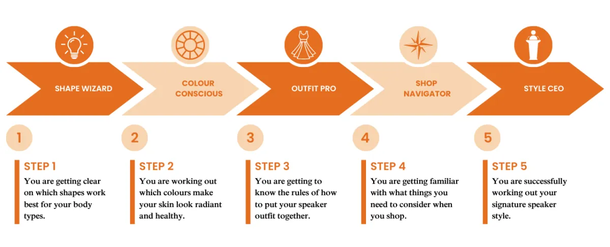 The only style programme designed specifically for female speakers using a simple five-step framework that gives you the confidence to charge more and helps you connect with bookers faster to get more gigs